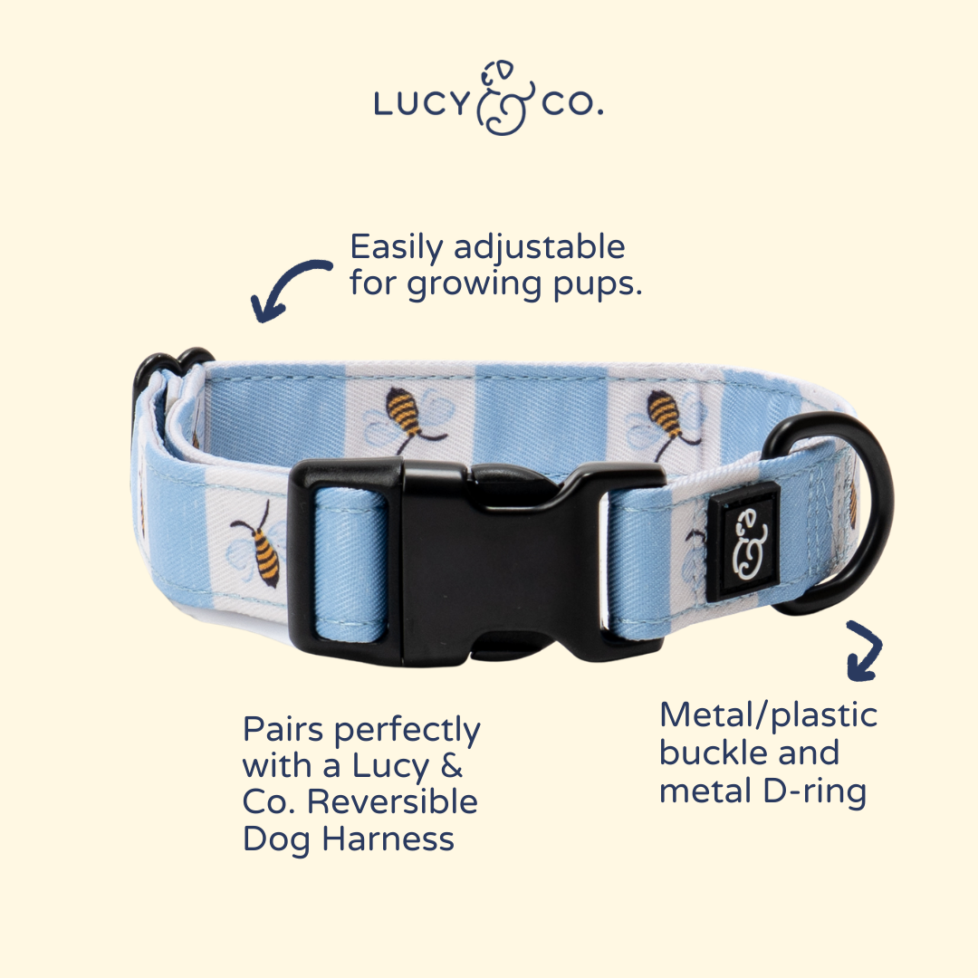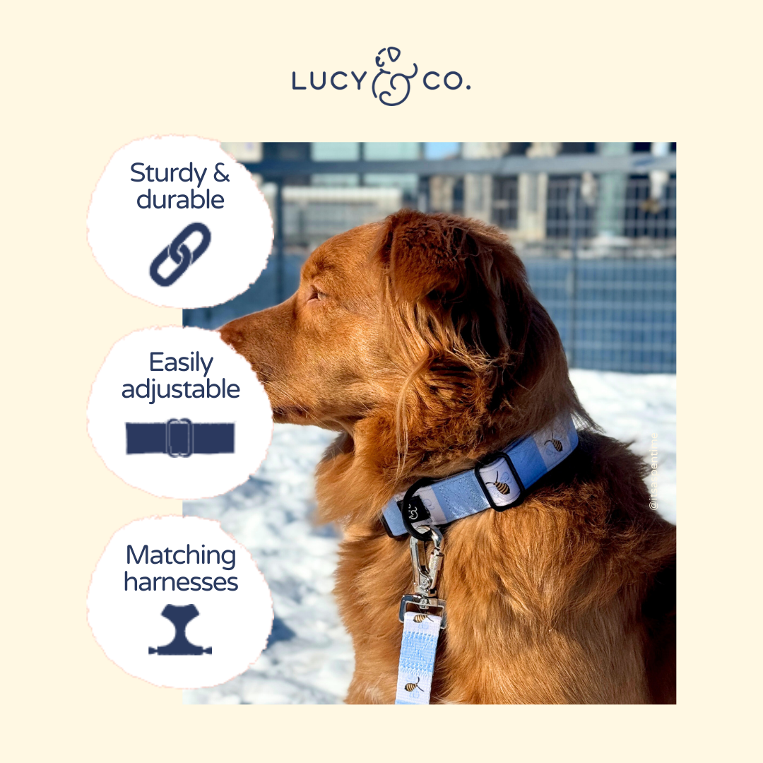 Who says everyday essentials should be boring? Not us! Our collars look good and feel great too: made from polyester webbing with some thoughtful hardware upgrades, this collar is durable and easy to care for, and it's the perfect match with our Bumbling Around Walk set and matching apparel.