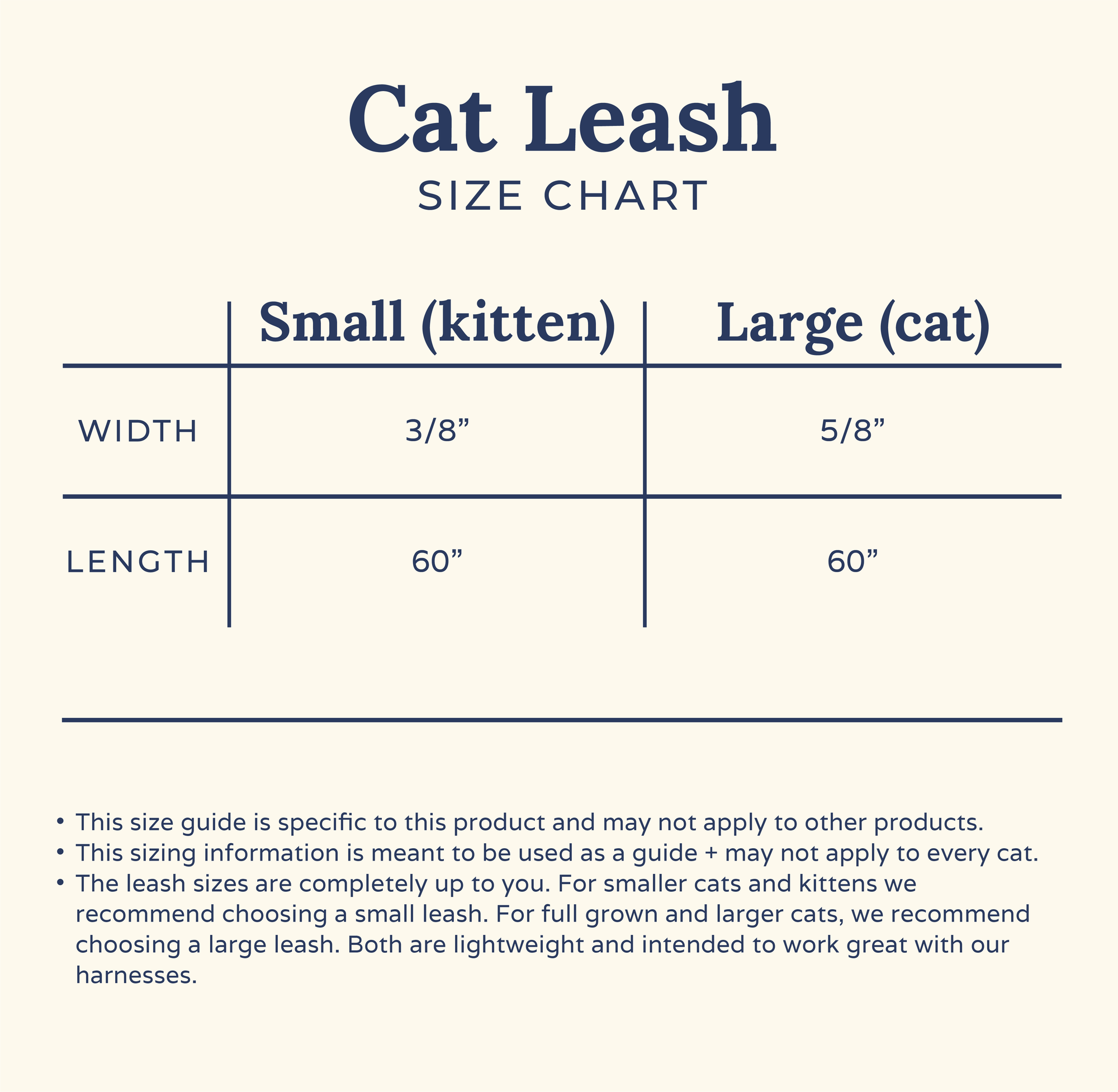 Eggcellent choice! Make walk time a breeze with our lightweight and durable cat leash—perfect for leash-trained cats or those just learning the ropes. Made from strong, fray-resistant nylon, this leash offers just the right balance of freedom and control. Clip it onto any standard harness, collar or stroller and let your cat explore with confidence, whether you're hitting the backyard or the big outdoors.