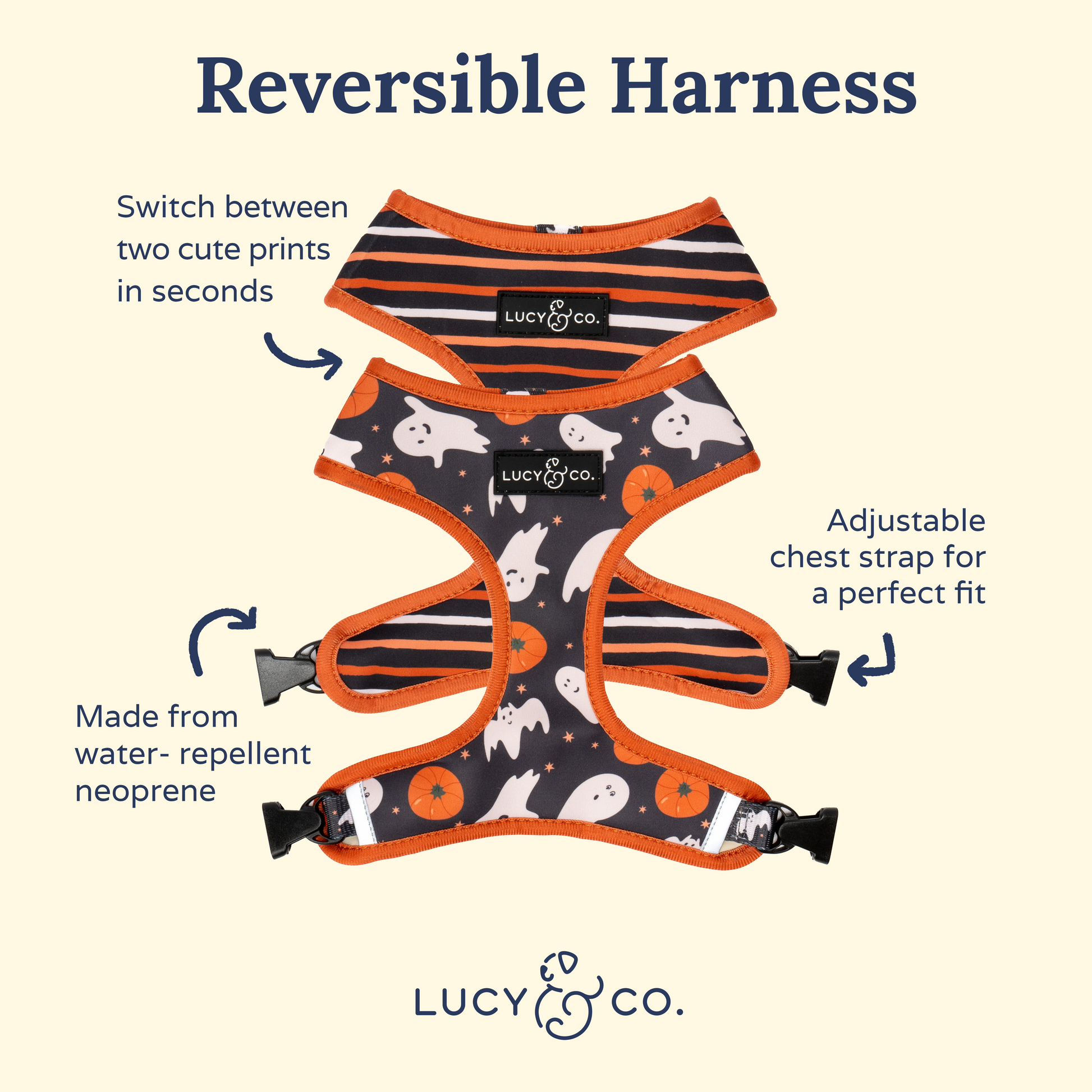 Haunting season is upon us and so are super spooky dog walks! Scare away the ghosts with our Happy Haunting Reversible Halloween Dog Harness. Made with water-repellant neoprene, this harness features two prints in one and it's easy to swap to the other side for a brand new look! Explore our reversible harnesses for an easy-care for fit that moves with all of your pups natural wiggles and shakes.