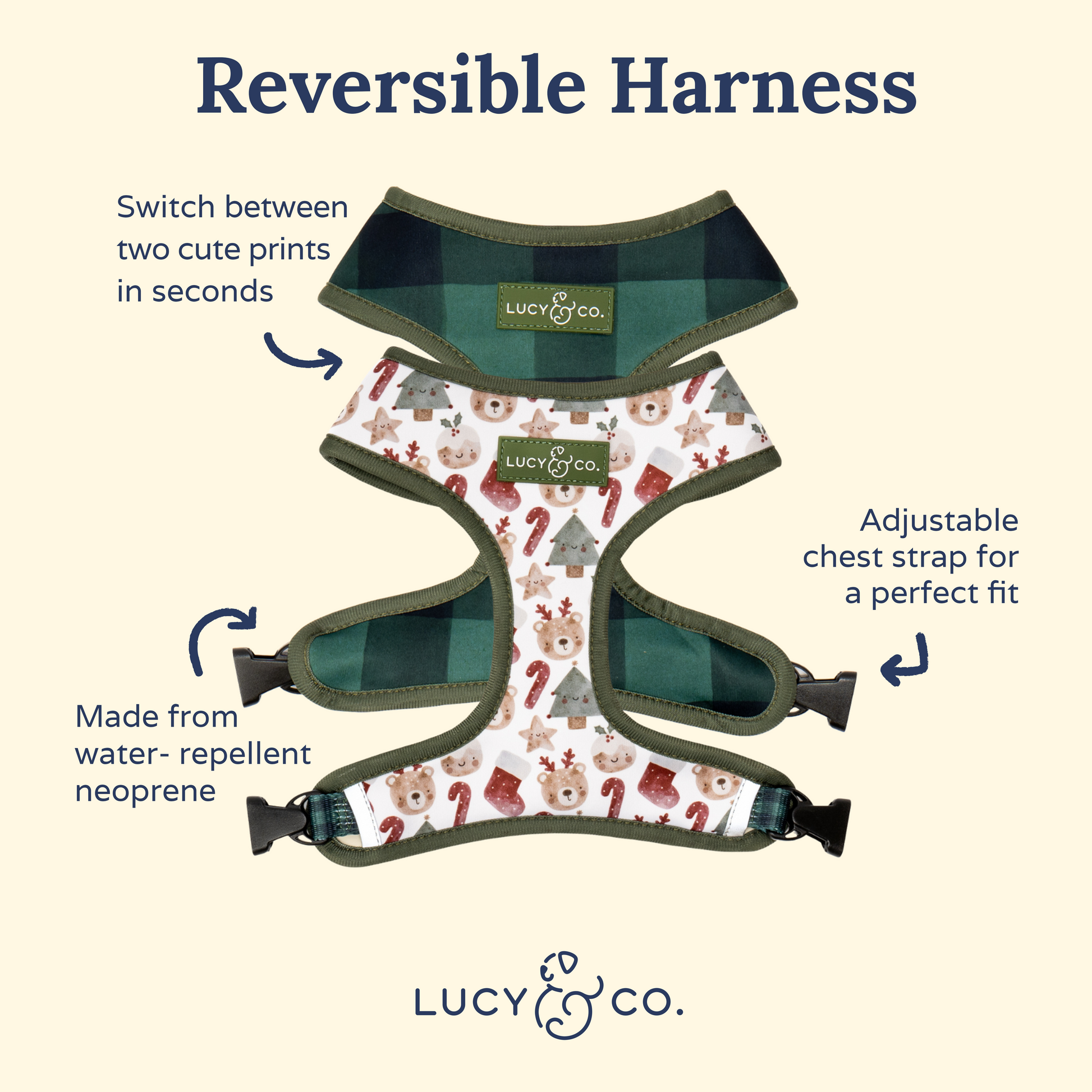 The Holiday Season is upon us and so are super festive dog walks! Ring in the happiest season of the year with our Jingle Bells Reversible Holiday Dog Harness. Made with water-repellant neoprene, this harness features two prints in one and it's easy to swap to the other side for a brand new look! Explore our reversible harnesses for an easy-care for fit that moves with all of your pups natural wiggles and shakes.