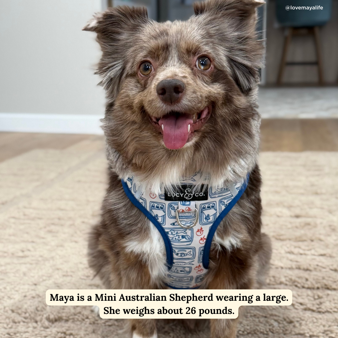 Not sure what size to order? Shoot us a note. Or are you not sure which Lucy & Co. Harness makes sense for your pup? Check out our blog!